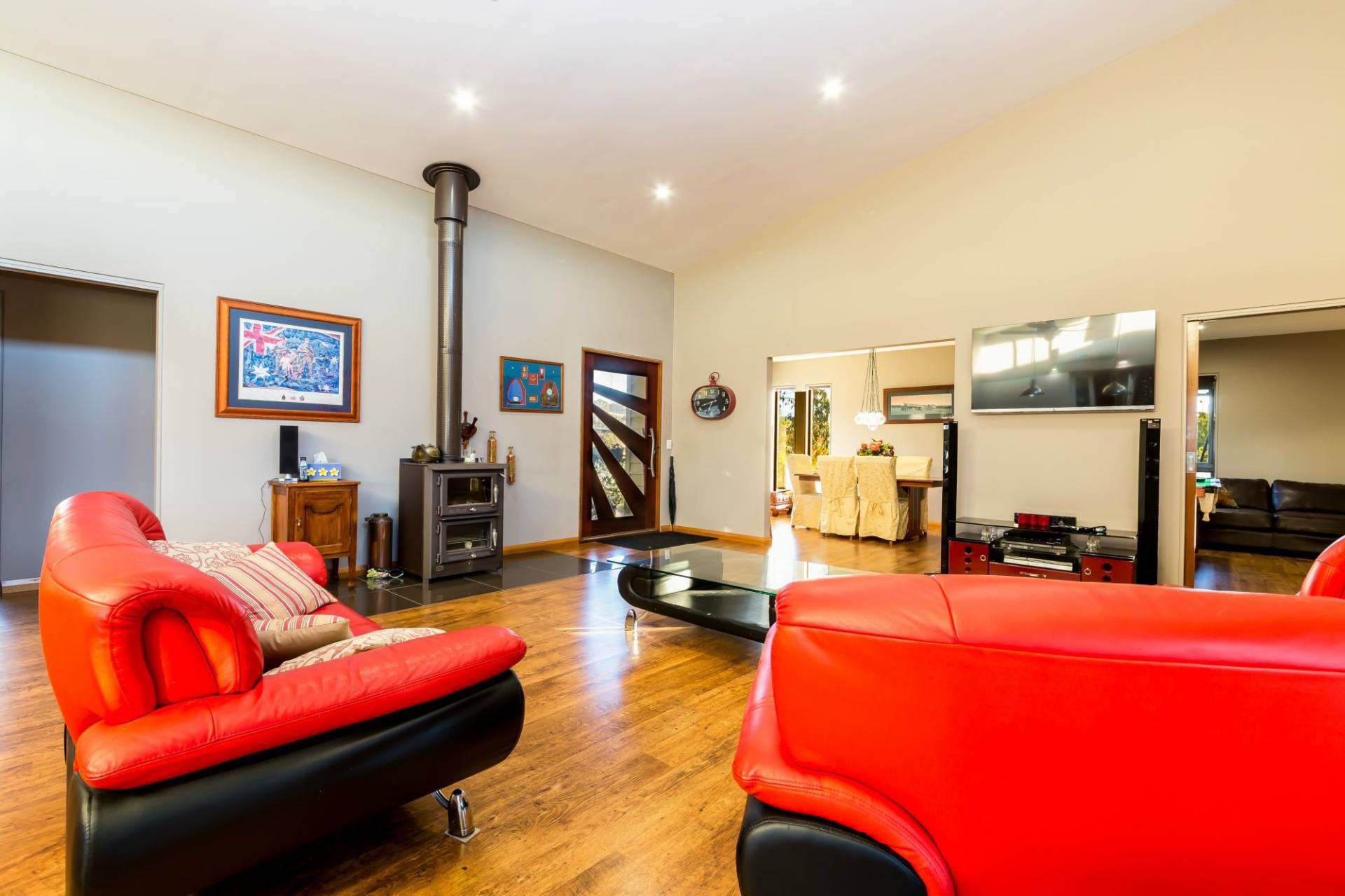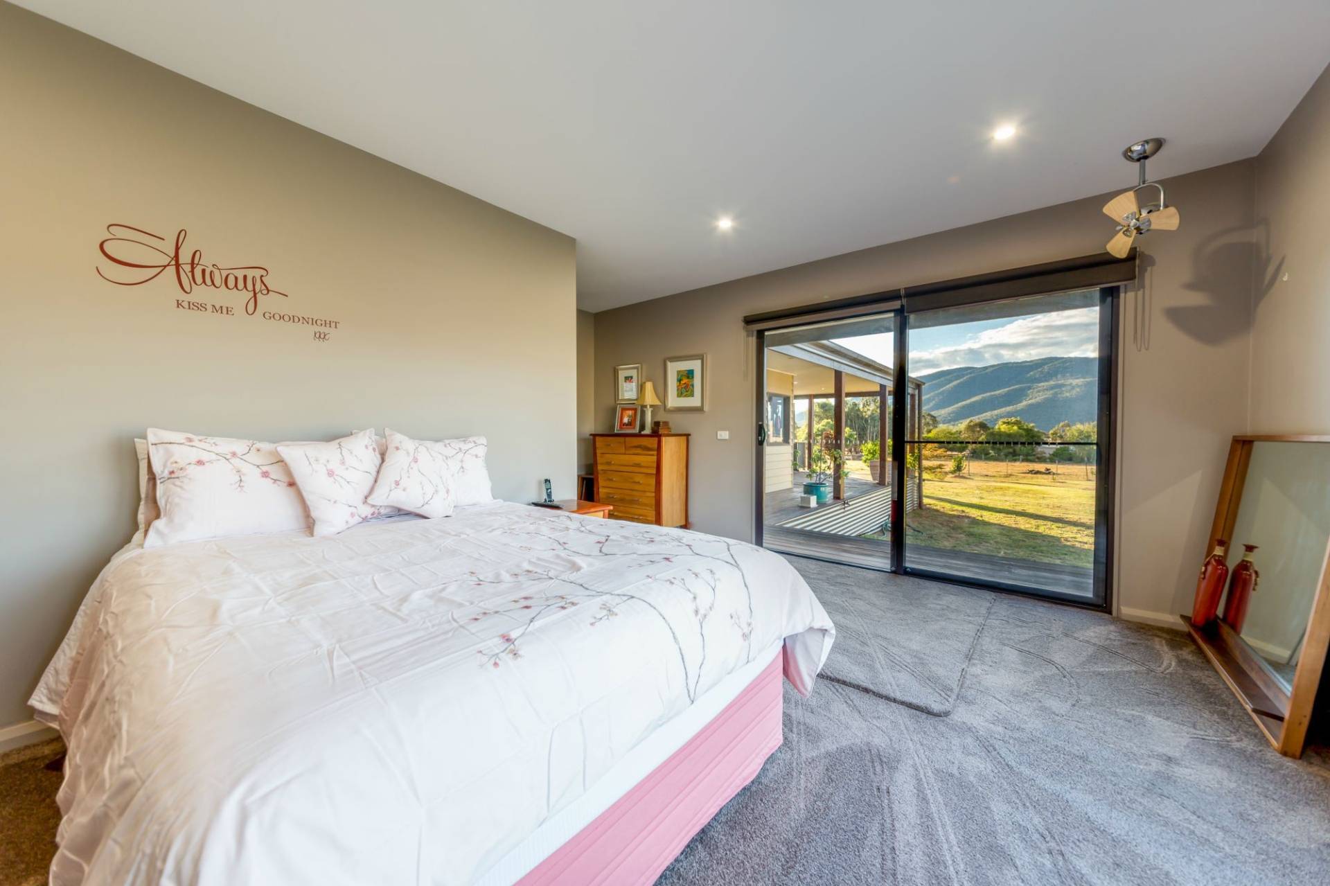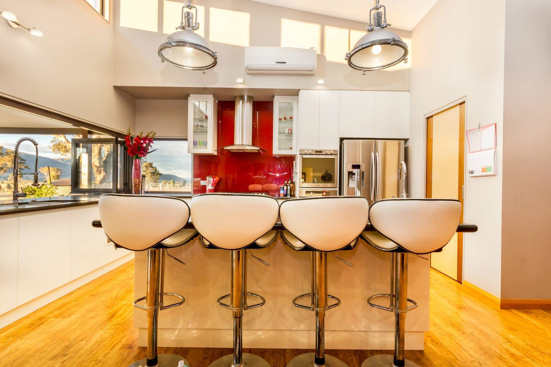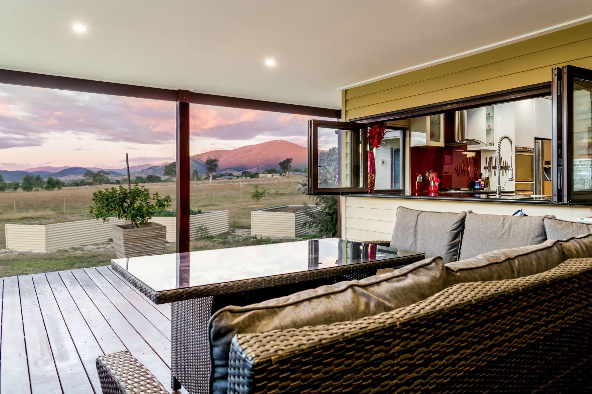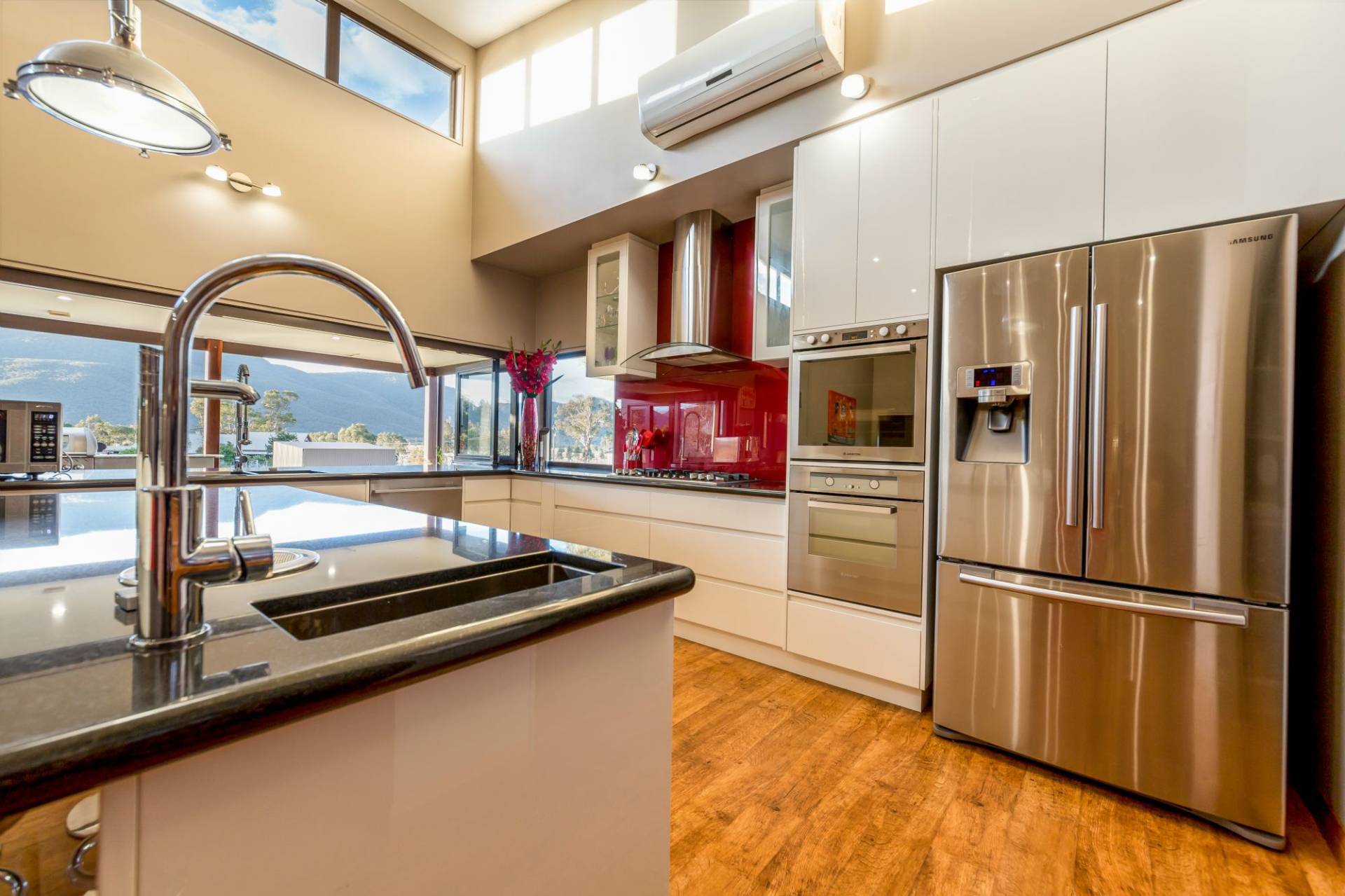 An impressive gourmet kitchen is fully equipped easily catering for large scale entertaining. The fireplace creates the perfect feature as the sun sets, while the high ceilings and uninterrupted views out to the valley and mountain provide the ultimate daytime panorama.